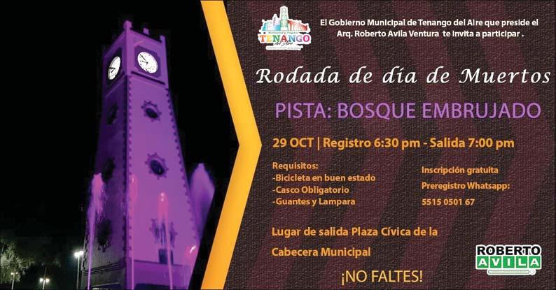 El sábado 29 de octubre habrá una rodada ciclista "Pista Bosque Embrujado", arrancará en la explanada municipal a las 19:00 horas,deberán registrarse los participantes de manera gratuita media hora antes.Para seguridad de los asistentes,se pide acudir con bicicleta en buen estado, casco obligatorio,guantes y lámpara,también pueden hacerlo al WhatsApp,5515050167.