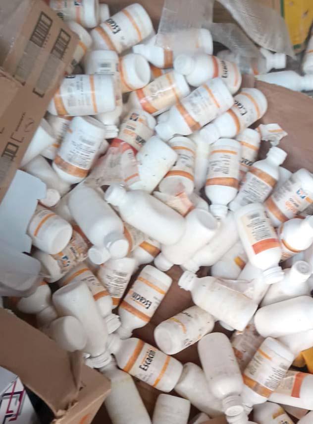 tos para uso o consumo humano.Además se hallaron diversas cajas,etiquetas, frascos,envases y códigos de marcas de medicamentos.