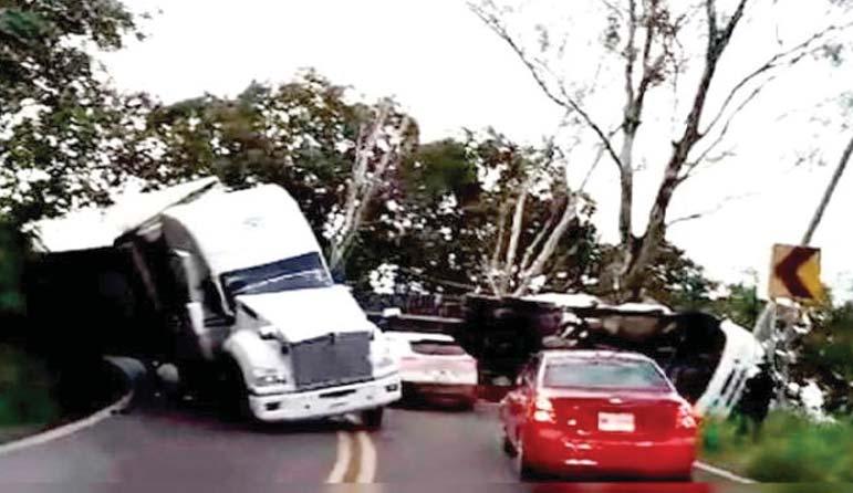 Ayer se reportó un accidente en que se vieron involucrados dos vehículos pesados,sobre la carretera federal 134,en su tramo Toluca-Ciudad Altamirano a Tejupilco en la llamada curva de La Pera. Los tráileres al circular por la cerrada curva chocaron por lo que uno de ellos se volcó.