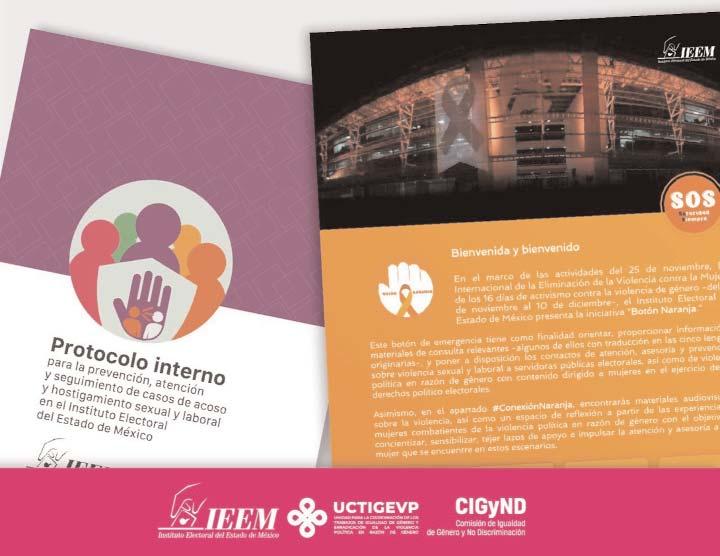 Además,cuenta con un espacio llamado #Conexión Naranja,apartado con el que se pretende generar un espacio de reflexión,a partir de las experiencias de mujeres combatientes de la violencia política en razón de género,para concientizar,sensibilizar,tejer lazos de apoyo e impulsar la atención y asesoría a quienes se encuentren en estos escenarios. En la sección de Datos Abiertos, el mini-sitio difunde infografías y otros materiales que orientan sobre cómo hacer visible la participación de las mujeres en la vida democrática. Además del Botón Naranja,el sitio oficial del IEEM aloja los mini-sitios de la Unidad para la Coordinación de los Trabajos de Igualdad de Género y Erradicación de la Violencia Política en Razón de Género (UCTIGEVP);del Observatorio de Participación Política de las Mujeres en el Estado de México