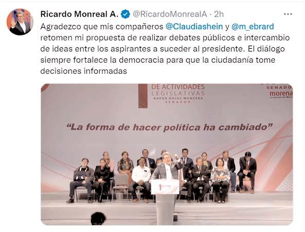 El coordinador de los senadores de Morena, Ricardo Monreal,agradeció a la jefa de Gobierno,Claudia Sheinbaum,y al secretario de Relaciones Exteriores,Marcelo Ebrard,retomar su propuesta para debatir e intercambiar ideas entre quienes aspiran a contender,dentro de su partido,a la Presidencia de la República.