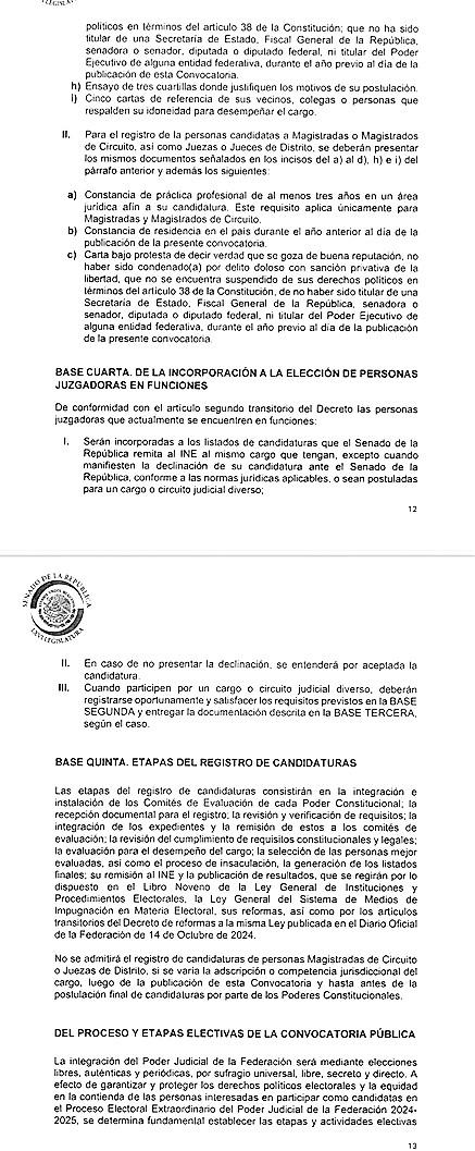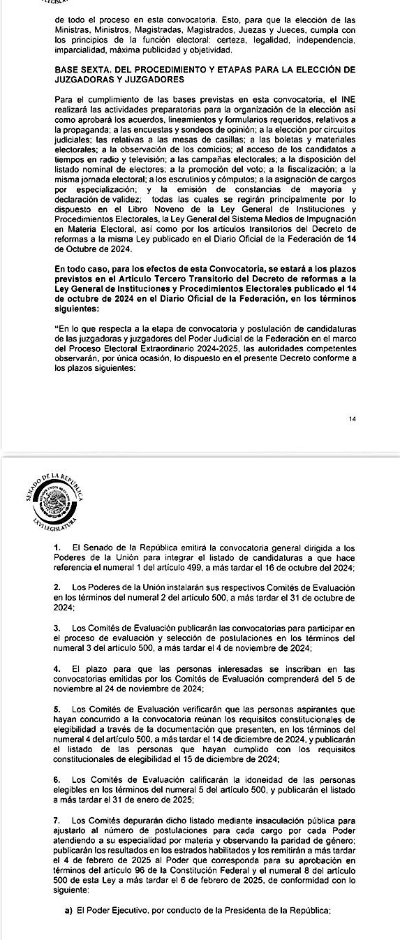El Senado de la República tiene lista,aun sinlas firmas de la oposición, la convocatoria para la elección de jueces, magistrados y ministros el próximo 1 de junio del 2025,ello en espera de que laoposiciónfirmeeldocumento para serpublicada. "SeconvocaalosPoderesdela Unión para que integren e instalen sus respectivos Comités de Evaluación…convoquenatodala ciudadanía a participar en la elección de las personas que ocuparán los cargos de ministras y ministros de la Suprema Corte de Justicia de la Nación,magistradas y magistrados de la Salas Superior y magistradas y magistrados Regionales del Tribunal ElectoraldelPoderJudicial", se lee en el comunicado emitido porel Senado de la República La convocatoria es para que se elijan 5 ministras y cuatro ministros de la Suprema Corte deJusticiadelaNación(SCJN); 3 magistradas y 2 magistrados del Tribunal de Disciplina Judicial. Una magistrada y un magistrado de la Sala Superior del Tribunal Electoral del Po-
