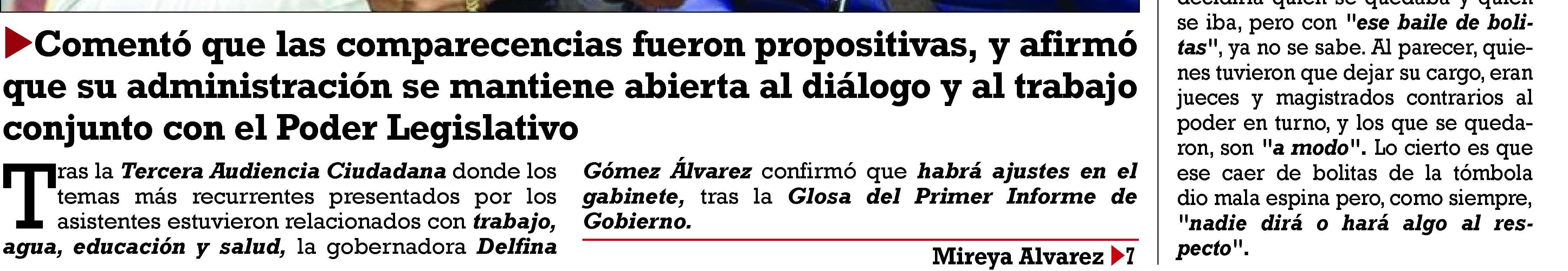 que sí se va a hacer",declaró. En relación con la posibilidad de que más funcionarios sean llamadosacomparecerporpartedelos legisladores, particularmente los deoposición,lamandatariaestatal afirmó que su administración se mantiene abierta al diálogo y al trabajo conjunto con el Poder Legislativo.