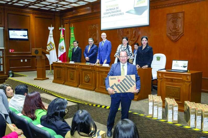 Con el propósito de establecer un proceso de mejora continua en la calidad educativa, a través del uso de las nuevas herramientas tecnológicasydigitales,elrector de la Universidad Autónoma del Estado de México (UAEMéx), Carlos Eduardo Barrera Díaz, presidióla5°Entregadecomputadoras portátiles a profesores de tiempo completo, medio tiempo,técnicos académicos y deasignatura,enla Sala "Benito Juárez García" del Edificio de Rectoría. Acompañado del secretario de Docencia, José Raymundo Marcial Romero y de la secretaria de Administración, Eréndira Fierro Moreno,Barrera Díaz comentó que la UAEMéx es una institución de nivel medio superior y superior que reconoce la