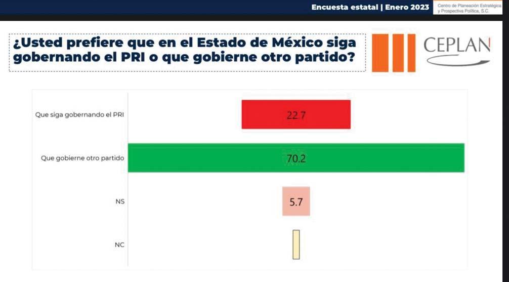 En el caso de la encuesta del Centro de Planeación Estratégica y Prospectiva Política (CEPLAN), publicada en enero,a la pregunta "¿Usted prefiere que en el Estado de México siga gobernando el PRI o que gobierne otro partido?",el 70.2 por ciento contestó "que gobierne otro partido", en tanto el 22.7 por ciento respondió "que siga gobernando el PRI".