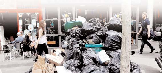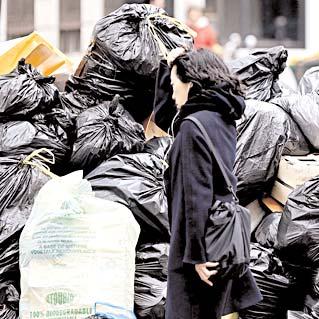 Entre la basura y los desechos.Así lucen las principales calles de París, en donde ya se acumulan 5 mil 400 toneladas de desperdicios que siguen sin ser recogidas hasta ayer domingo por la huelga de los recolectores,que por séptimo día consecutivo expresan su rechazo a la reforma de las pensiones,según la alcaldía
