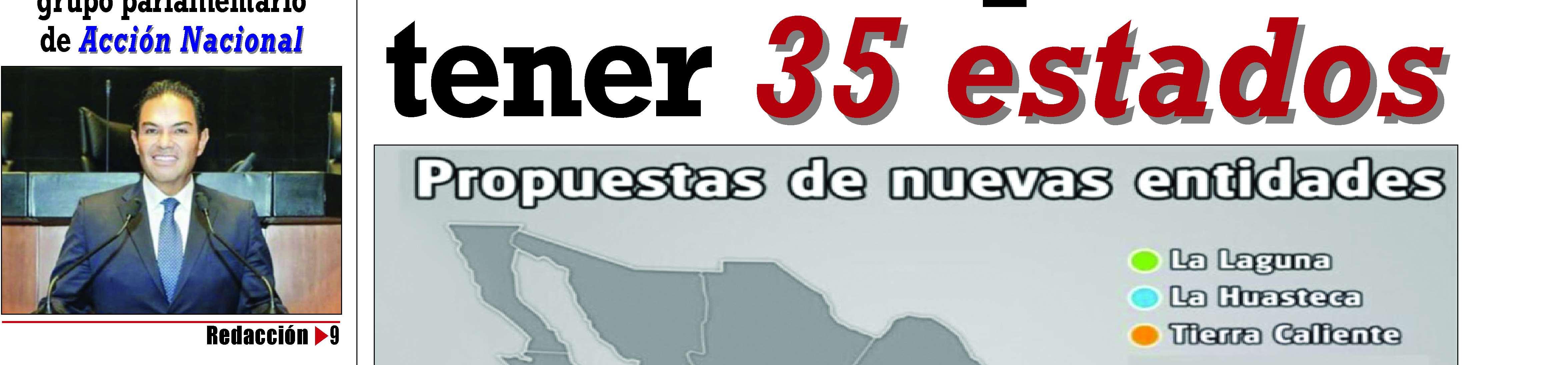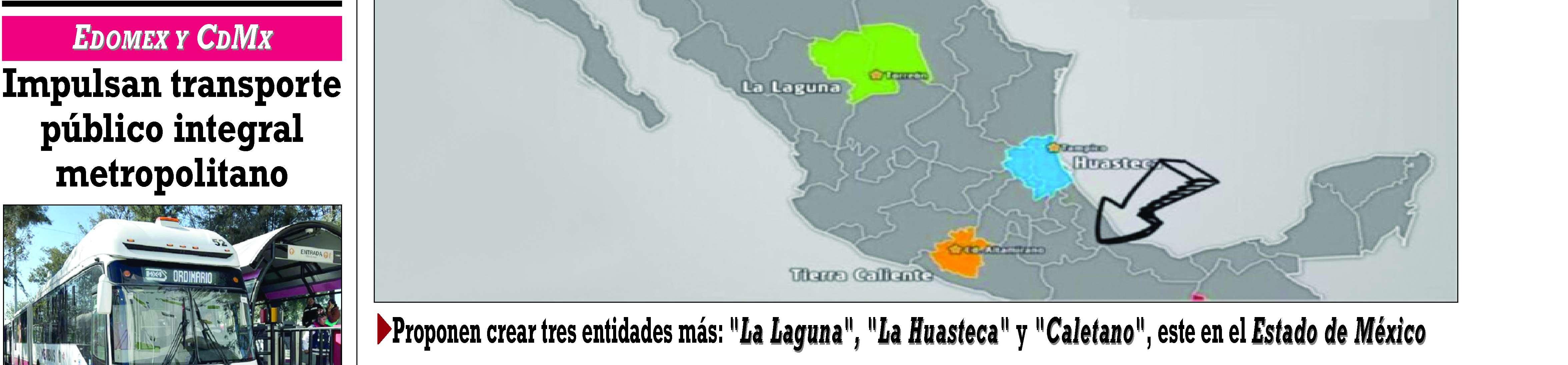 l país podría tener una modificación ante la posible creación de tres nuevos estados, cuando actualmente México cuenta con 32. Los tres nuevos estados que se proponen serían enelnortede México,en la región central y en el sur del país,y se tratarían de "La Laguna", "La Huasteca" y "Caletano", localizado en la región centro del país, más colindante con el océano Pacífico, en la llamada "Tierra Caliente", por lo que estaría conformada por municipios de Michoacán y Guerrero y el sur del Estadode México.