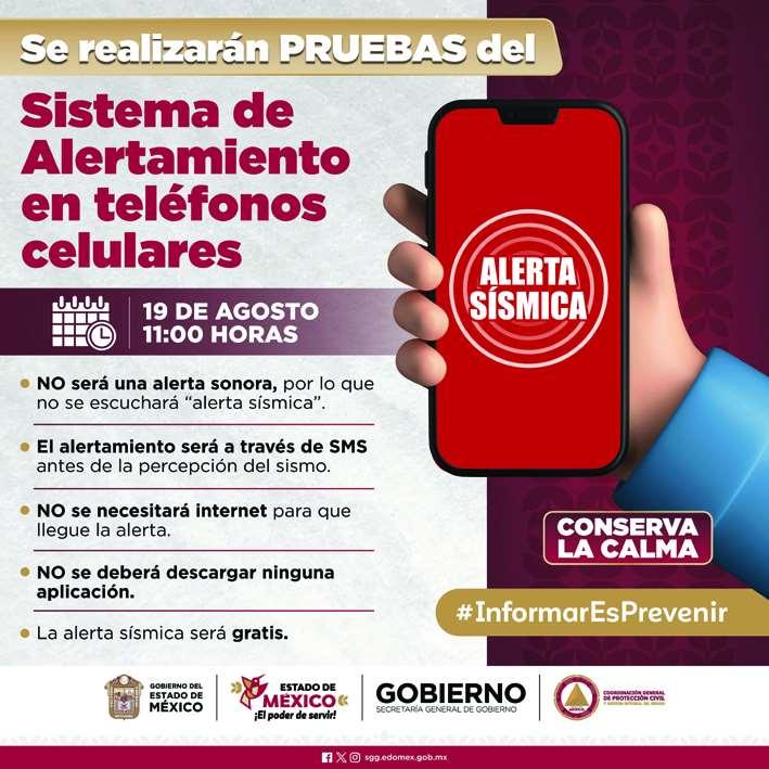 Toluca,México.- Protección Civil del Estado de México informa que,este lunes 19 de agosto a las 11:00 horas, se realizarán pruebas del Sistema de Alertamiento en teléfonos celulares a través de mensajes SMS con la hipótesis de un sismo.