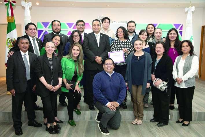 Martha Valdespino Vargas, Coordina dora General de Comunicación Social y Edgar Marín Pérez, Titular de la UnidaddeTransparenciarecibieronla Mención Especial de manos de José Martínez Vilchis, comisionado presidente del Infoem y de los Comisiona dos Luis Gustavo Parra Noriega y SharonMorales Martínez.