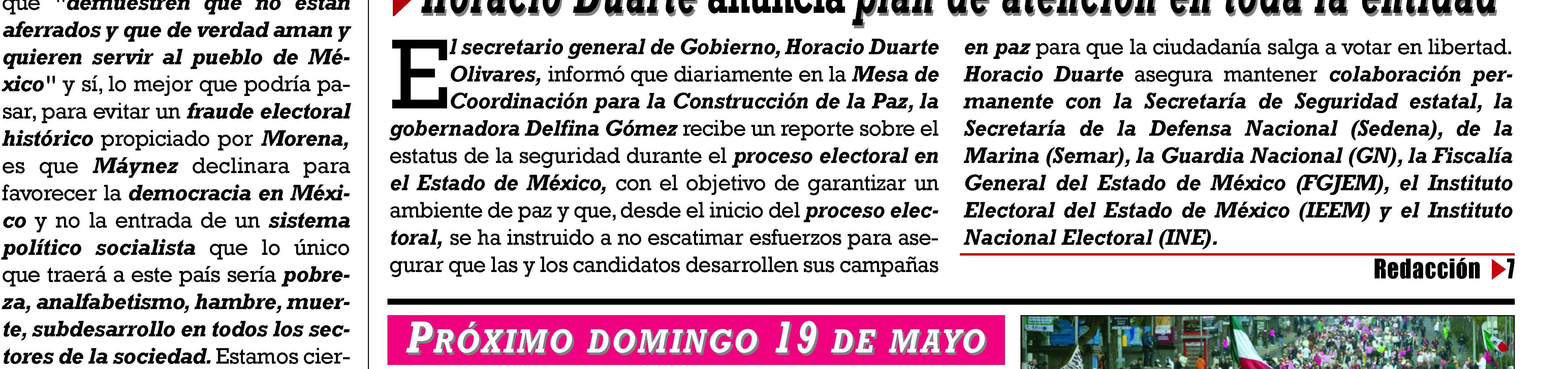 Explicó que, desde el inicio del Proceso Electoral, la Gobernadora Delfina Gómez instruyó no escatimar esfuerzos para asegurar que las y los candidatos desarrollen sus campañas en paz para que la ciudadanía salgaa votar en libertad.