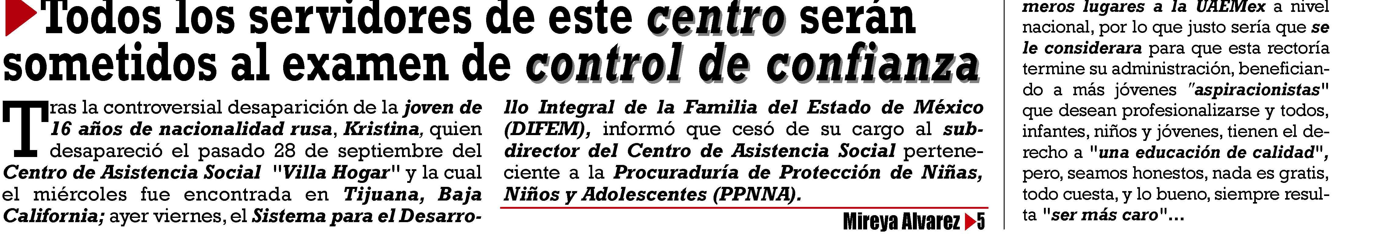 Toluca, México.- Tras la controversial desaparición de la joven de 16 años de nacionalidad rusa Kristina,la cual desaparecio el pasado 28 de septiembre del Centro de Asistencia social (CAS) "Villa Hogar" ylacualeldíamiércolesfue encontradaenTijuana,BajaCalifornia;este viernes el Sistema para el Desarrollo IntegraldelaFamiliadelEstadodeMéxico (DIFEM), informó que cesó de su cargo al Subdirector Centro de Asistencia Social perteneciente a la Procuraduría de Protección de Niñas,Niños y Adolescentes (PPNNA)
