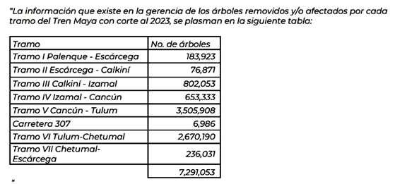 Conrespectoaesto,lasautoridadesdelpaís yahabíanprometidoqueseríansembrados entre450y500millonesdeárbolesenlazona derecorridodelTrenMaya,quecorrepor cincoestados,sinembargo,alafechanosehan reveladocifrasdecuántosyafueronsembrados