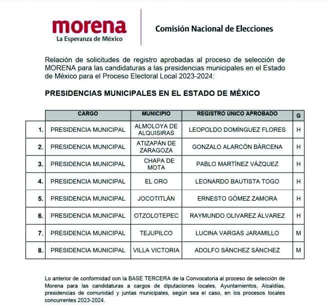 Toluca, México.- En las últimas horas de este miércoles comenzó a circular una lista con ocho nombres de candidaturas aprobadas por el partido Morena para las alcaldías del Estado de México.