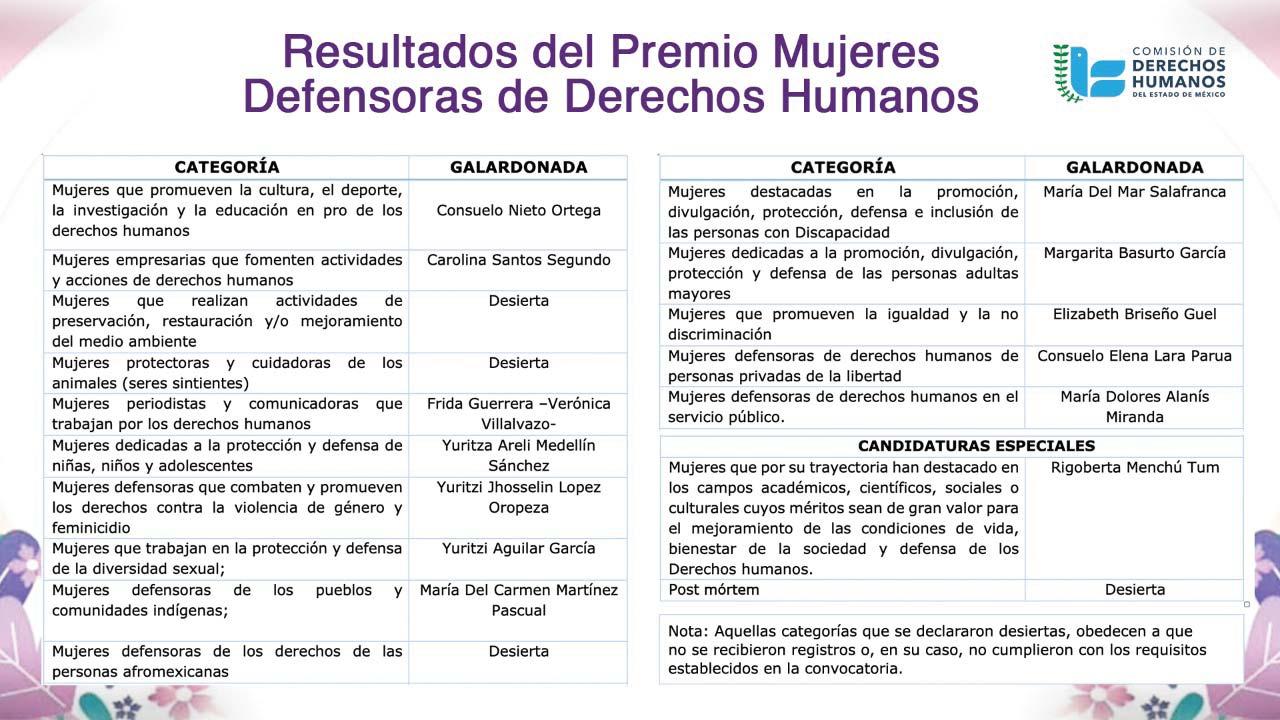 La Comisión de Derechos Humanos del Estado de México (Codhem) a través del Comité de Selección para el "Premio Mujeres Defensoras de Derechos Humanos" seleccionó a las galardonadas,de acuerdo al cumplimiento de los requisitos en las 20 categorías establecidas en la convocatoria.