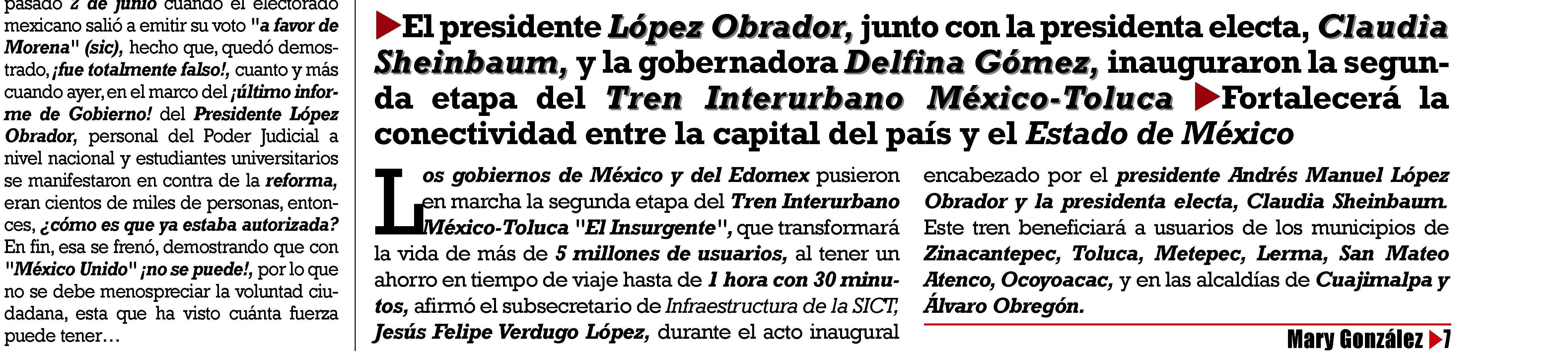 Los gobiernos de México y del Edoméx pusieron en marcha la segunda etapa del Tren Interurbano México-Toluca "El Insurgente",quetransformarálavidademásde 5 millones de usuarios, al tener un ahorro en tiempo deviaje de hasta 1hora con 30minutos, afirmó el subsecretario de Infraestructura de la SICT,JesúsFelipeVerdugoLópez,duranteelacto inauguralencabezadoporel presidenteAndrés ManuelLópezObradorylapresidentaelecta, ClaudiaSheinbaumPardo.