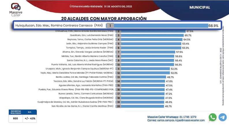La más reciente encuesta de Massive Caller colocó nuevamente a la presidenta municipal de Huixquilucan,Romina Contre ras Carrasco,como la alcaldesa mejor evaluada del país y del Estado de México, lo que ratifica su liderazgo a nivel nacional al ocupar esta posición por cinco meses,tras desarrollar un gobierno cercano con la gente,originar una de las más bajas percepciones de inseguridad y contar con una alta confianza de los ciudadanos. En el Ranking de Aprobación Ciudadana de Massive Caller, correspondiente al mes de agosto de 2022, Romina Contreras obtuvo un resultado de 68.9 por ciento,el más elevado en tre los 104 alcaldes evaluados para esta medición,lo que la sitúa en el primer sitio;posición que ha ocupado en los meses de marzo, abril, mayo, junio y agosto en distintas casas encuestadoras que han medido el desempeño de las administraciones locales en los casi nueve meses que han transcurrido en el año. En esta encuesta también destaca que Huixqui lucan es uno de los seis municipios del país con la mejor percepción de seguridad por parte de los ciudadanos,donde ocho de cada diez huixquiluquenses manifestaron sentirse seguros de vivir en este territorio,una de las mejores cifras del país y que es resultado de los esfuerzos que se han realizado en esta materia para brindarles mayores herramientas a los policías,como patrullas y motopatrullas,aunado a que continuamente reciben capacitación a través de la Cruzada Municipal contra la Violencia y la Delin cuencia. Además,en la medición levantada el pasado 31 de agosto,los huixquiluquenses colocaron a Romina Contreras como una de las cinco alcaldesas del país con el mayor índice de confianza con un respaldo del 52 por ciento de los encuesEltados.pasado viernes 02 de septiembre,la empresa Demoscopia Digital colocó a Romina Contreras en el segundo lugar a nivel nacional en el Ranking de Aprobación de Alcaldes,correspondiente al mes de agosto de 2022,al obtener una aprobación ciudadana de 69.8 por ciento, la segunda más alta entre 188 ediles de todo el país y a solo 0.3 puntos del primer lugar.En dicha encuesta, siete de cada 10 huixquiluquenses respondieron que aprueban su trabajo.