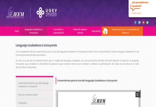 4 INFORMACIÓN GENERAL El Instituto Electoral del Estado de México (IEEM), desarrolla diversas estrategias y acciones que favorezcan el ejercicio de los derechos político - electorales de las mujeres,en igualdad de condiciones,libres de violencia y discriminación. Ejemplo de lo anterior,se destaca la elaboración de materiales audiovisuales como infografías, vídeos y GIF,que se difunden en las redes sociales en la cuenta @IEEM_MX de Twitter e Instagram y en Facebook en "IEEM Oficial" sobre qué es la violencia de género,dónde se presenta,y ante qué instancias se puede presentar una denuncia.Lo anterior,con el objetivo de sensibilizar a la ciudadanía sobre esta problemática y acercar información oportuna a mujeres en el ejercicio de sus derechos político-electorales. A su vez,y como parte de la iniciativa presentada por la consejera electoral,Maestra Patricia Lozano Sanabria,se desarrolló el "Botón Naranja", alojado en la página web institucional www.ieem.org.mx,que busca orientar y proporcionar información a través de materiales de consulta -algunos de ellos con traducción a las cinco lenguas originarias- ,sobre violencia sexual y laboral a servidoras públicas electorales, así como de violencia política en razón de género con contenido dirigido a mujeres en el ejercicio de sus derechos político-electorales, además de poner a disposición las vías de contacto para atención y Asimismo,enasesoría.el apartado #ConexiónNaranja,en el cual,se destacan materiales audiovisuales sobre la violencia,se pretende generar un espacio de reflexión,a partir de las experiencias de mujeres combatientes de la violencia política en razón de género,con el objetivo de concientizar,sensibilizar,tejer lazos de apoyo e impulsar la atención y asesoría a quienes se encuentren en estos escenaEnrios.el mini-sitio correspondiente a la Unidad de Género y Erradicación de la Violencia,alojado en la página institucional,se difunde información sobre el uso correcto del lenguaje ciudadano e incluyente,infografías e investigaciones para hacer visible la participación de las mujeres en la vida democrática.Complementario a ello,se puede consultar el mini sitio del Observatorio de Participación Política de las Mujeres en el Estado de México,del cual el Instituto forma parte. IEEM
