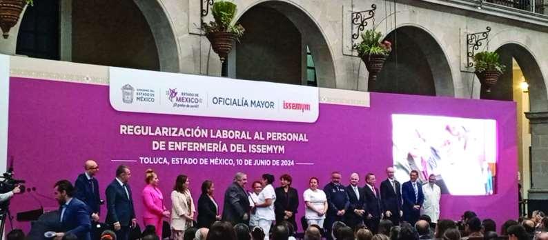 "Yo creo que vamos a poder lograr más beneficio para nuestros compañeros, háganle llegar a los enfermerosyenfermerasquevamospormás,que esta es una primera etapa y que vamos a seguir atendiendo a esa necesidad. Actualmente el ISSEMyM cuentaconunaplantilladedosmil847 enfermeras y enfermeros de base y 9 de cada 10 trabajadores del servicio de enfermería son mujeres, 394 cuentan con el grado de maestría, mil 123 con licenciatura,234 con especialidad,42 de ellos con doctorado y mil 057 son técnicos auxiliares que también nos hacen favor de apoyarnos;por ello este acto insisto es de justicia,en beneficio de las personas trabajadoras de la salud,hoy saldamos una deuda más,iniciamos la regularización laboral de las enfermeras y enfermeros de nuestra institución que es la más grande del país",manifestó Álvarez Gómez. Aunado a ello, la mandataria estatal dijo que más allá de beneficiar a 100 familias con el ánimo genuino pero sobre todo con el derecho de vivir con tranquilidady conestabilidadensu trabajo, además de tener la seguridad laboral también indicó que habrá un aumento salarial y lo más importante que se considerará la antigüedad para que se pueda sumar a lo que es lo que ya tienen más de 15 años trabajando y que de acuerdo a la ley tienen derecho a esa y otras prestaciones laborales, como el de tener vacaciones dignas.