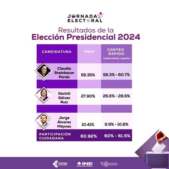 Por último, Sheinbaum Pardo se pronunció ensus redessocialessobrela informaciónproporcionada por el organismo electoral. "Eldía dehoyel@INEMexicodioaconocerlosresultados oficiales de los cómputos distritales. Con el 61.04por ciento de participación ciudadana,obtuvimos59.7594porcientode