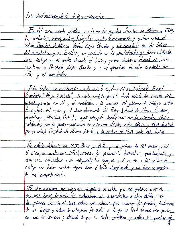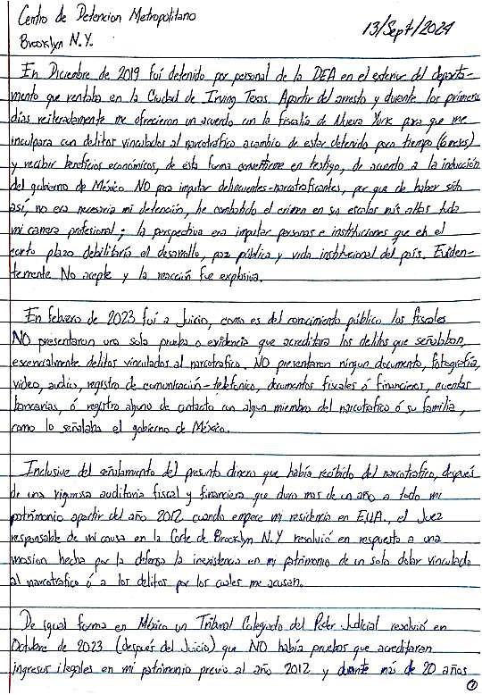 En contraparte, García Luna, en una misiva escrita a mano y enviada al periodista Keegan Hamilton, del diario estadounidense Los CONTINÚAENPÁGINA13