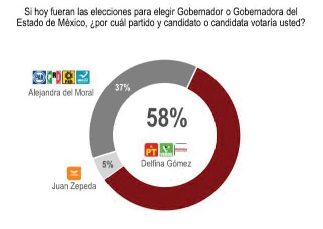 En el estudio,a la pregunta "Si hoy fueran las elecciones para elegir Gobernador o Gobernadora del Estado de México, ¿por cuál partido y candidato o candidata votaría usted?", la maestra Delfina Gómez obtuvo el 58 por ciento de intención de voto,por 37 por ciento para Alejandra del Moral,una ventaja de 21 puntos.