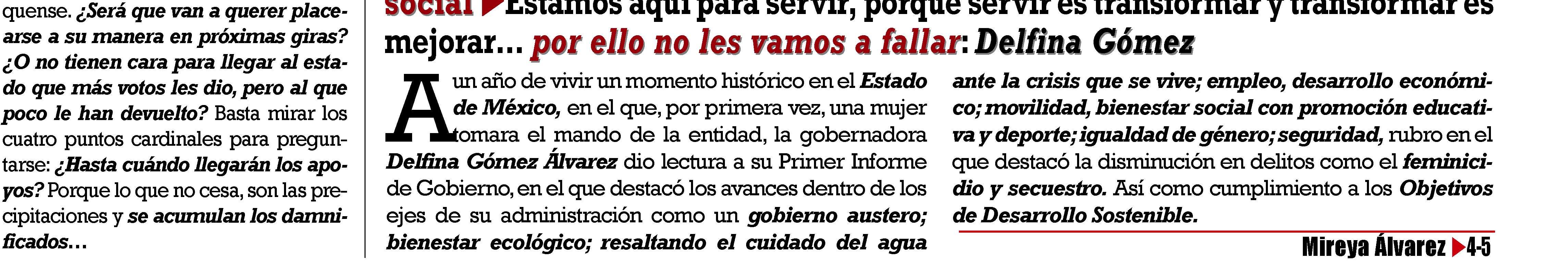 Toluca,México.-AunañodevivirunmomentohistóricoenelEstadodeMéxico,endondeporprimeravez unamujertomaraelmandodelaentidadyconellose incorporarála4Tconlaconviccióndealcanzarelprogresoyelbienestardemillonesdemexiquenses"para concretarelcambioconrumbo,conorigenycondestino,quepusierafinalexcesodeprivilegios,corrupcióny desigualdades,parainstaurarunaépocadeesperanza, conunauténticogobiernodelpuebloyparaelpueblo, empático,humanista,conhonradezyhonestidad,dela manodelpuebloyatendiendoenelquetodoslossueños yaspiracionesdelagentetengancabida". FueasícomolagobernadoraDelfinaGómezÁlvarez abriósudiscursoparadarinicioasuprimerInformede Gobiernoenelquedestacólosavancesdentrodelos ejesdesuadministracióncomoungobiernoaustero; bienestarecológico;resaltandoelcuidadodelagua antelacrisisquesevive;empleo,desarrolloeconómico;movilidad,bienestarsocialconpromocióneducativaydeporte;igualdaddegénero;seguridad,rubroen elquedestacóladisminuciónendelitoscomoelfeminicidioysecuestro.Asícomocumplimientoalos