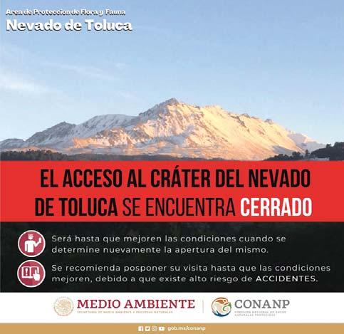 Debido a un accidente en el acceso al Nevado de Toluca que causó lesiones a 15 personas, dos de ellas de gravedad, autoridades decidieron cerrar el paso a paseantes y visitantes al volcán Xinantécatl. La falta de precaución y previsión de quienes pretenden admirar el paisaje,tras la primera nevada,ocasionó incidentes,algunos graves, pues no se toman en cuenta las recomendaciones de seguridad y los cuerpos de socorro deben atender las emergencias que se registran.Lo anterior, no quita lo majestuoso que luce el coloso en esta época.