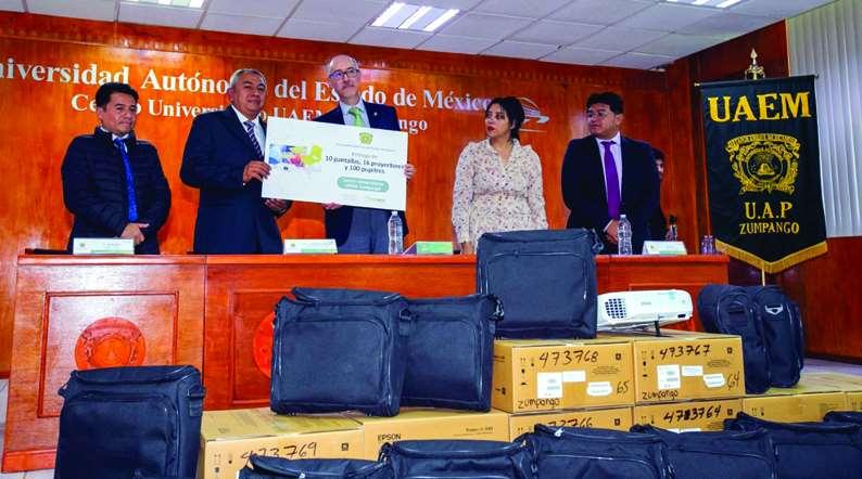 así como la adecuación de tres aulas. De igual manera,entregó cinco pantallas de 65 pulgadas y cinco proyectores, en beneficio de una comunidad de dos mil 29 alumnos,docentesytrabajadoresadministrativos. Posteriormente,en el CentroUniversitario Zumpango, donde se ofrecen las licenciaturas en Ciencias Políticas y Administración Pública, Derecho, Sociología, Psicología, Enfermería, Diseño Industrial, Agrónomo en Producción, Turismo, Contaduría y