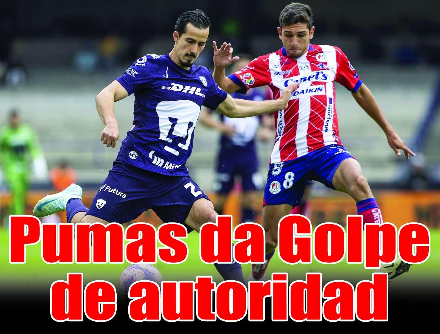 solo tuvo que empujar el balón y así finiquitar el encuentro. Cabe resaltar que, tras casi un mes sin actividad, Jorge Ruvalcaba entró de cambio y regreso a las canchas. Con esta victoria, Pumas llegó a cinco juegossinperderysecolocóen la5taposición de la tabla general con 23 puntos; San Luis bajó a 7mo con 20 unidades. A mitad de semana, los dirigidos por Gustavo Lema visitarán el BBVA para el duelo ante Rayados y tres días después se medirán ante Cruz Azul en el Estadio Olímpico Universitario.