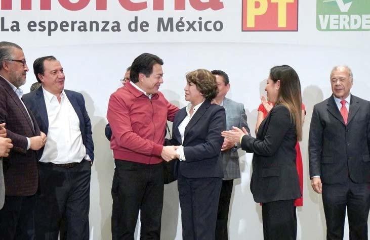 Dirigentes nacionales y estatales de Morena, PT y PVEM anunciaron que competirán juntos bajo la figura de candidatura común rumbo a la elección por la gubernatura del Estado de México,que se llevará a cabo el próximo 4 de junio,para lo cual solo se hará uso de un logotipo y la imagen de Delfina Gómez, pues se prevé será la candidata oficial.