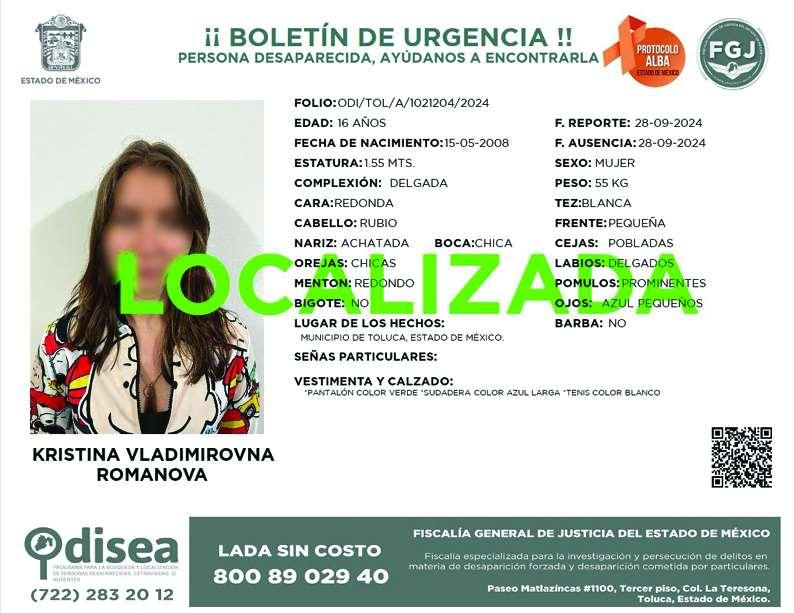 Luego de que el día de ayer, Marina Romanova acudiera al Centro de Justicia para las Mujeres a entrevistarse con las autoridades estatales sobre la desaparición de su hija Kristina Vladimirovna Romanova, este jueves la Fiscalía General de Justicia del Estado de México (FGJEM) confirmó el hallazgo de la adolescente de 16 años de origen ruso.
