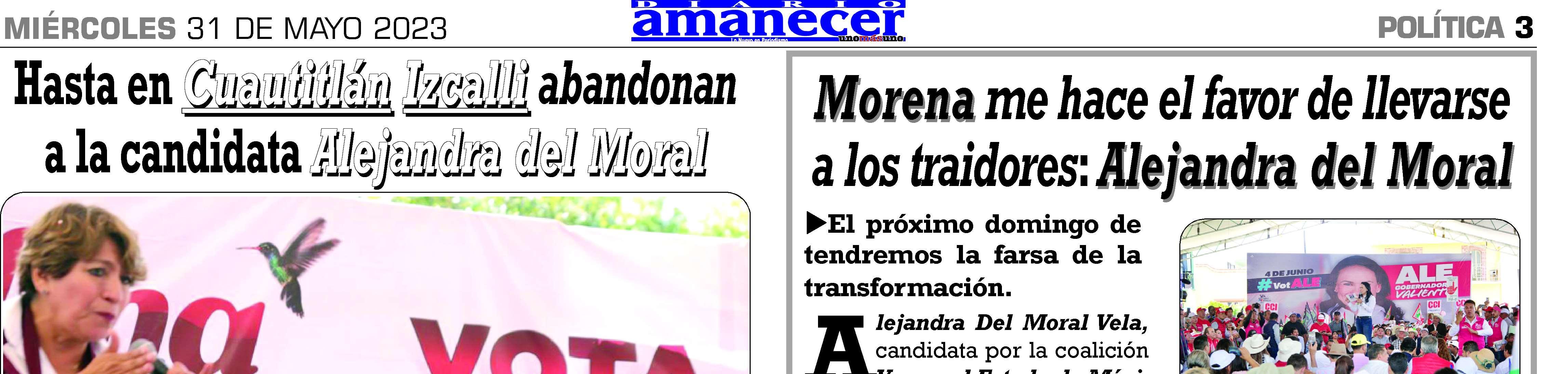 El fin de semana el PRI lanzó toda su carne al asador para remontara Morena,sinembargo AlejandradelMoral vaenla carrera totalmente sola. De lo que suceda en el Estado de México sedefinirá la ruta críticade todoslospartidos,de cara a las elecciones presidenciales del 2024.