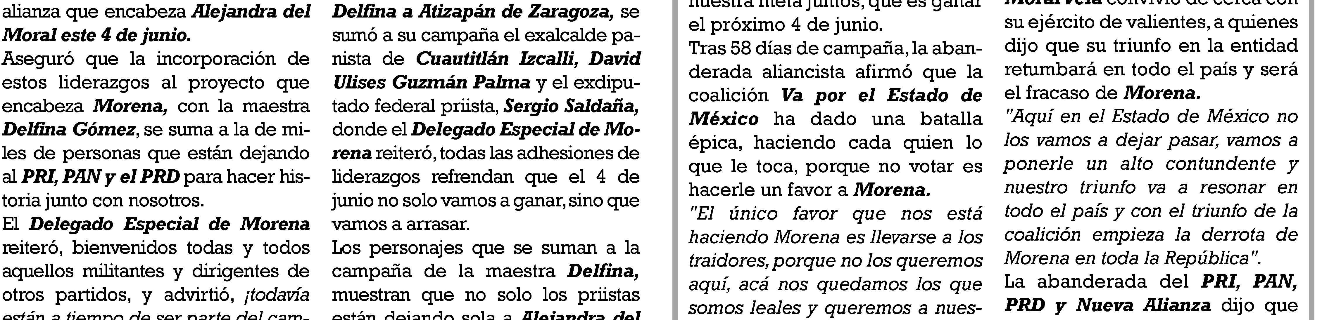 Oriente: En Nezahualcóyotl la maestra Delfina inició su campaña con aproximadamente 300 mil votos y hoy cuenta con unos 950 mil sufragios,la candidata de Va por México ya perdió prácticamente la mitad del municipio.Y en la alcaldía de Chalco,la ex secretaria de Educación Pública,tenía seguros alrededor de 150 mil votos al iniciar la carrera electoral, hoy tendría cerca de 700 mil votos en esa demarcación, por más quealgunos medios afinesal PRI-PAN ylo quequeda del PRD, insisten en que el margen de diferencia entre ambas candidatas es de apenas 4 puntos y que ya se puede señalar un "empate técnico" al día de hoy.