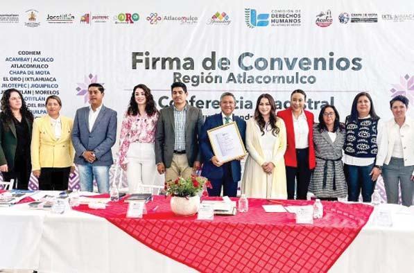 Campo,Leticia Mejía García;la presidenta honoraria del DIF de Temascalcingo,Araní López Rey; el secretario general de la Codhem,Jesús Ponce Rubio;el director del Instituto de Investigaciones y Formación en Derechos Humanos,Miguel Ángel Cruz Muciño;y titulares de defensorías municipales de derechos humanos,entre otras autoridades. La presidenta de la Codhem destacó que es el primer ejercicio para firmar convenios de colaboración regionales.La finalidad es sumar las voluntades para generar una alianza con los Ayuntamientos,al ser la autoridad más cercana a la ciudadanía,para lograr que las personas disfruten las acciones de gobierno.