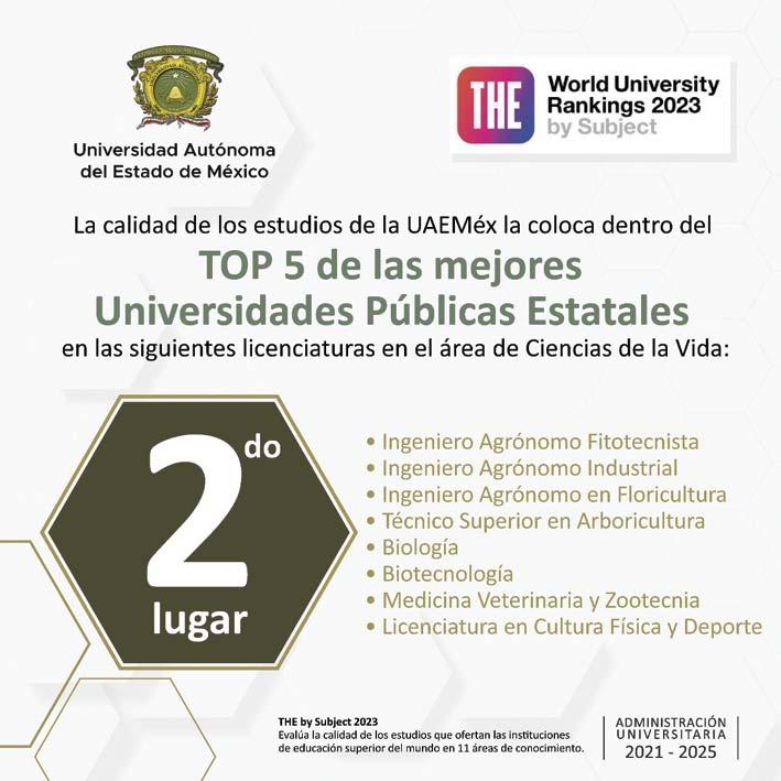 Toluca,México.- Por la calidad de la educación que ofrece en el área de Ciencias de la Vida,la Universidad Autónoma del Estado de México (UAEMéx) es reconocida por los World University Rankings 2023 by Subject de Times Higher Education (THE) como la segunda mejor entre las Universidades Públicas Estatales y la cuarta de mayor calidad entre las Instituciones de Educación Superior mexicanas,incluidas públicas y privadas. Mediante un comunicado de informó que,la Máxima Casa de Estudios mexiquense ocupa la segunda posición entre las Universidades Públicas Estatales del país en el área de Ciencias de la Vida,que comprende los programas académicos de:Ingeniero Agrónomo Fitotecnista, Ingeniero Agrónomo Industrial,Ingeniero Agrónomo en Floricultura y Técnico Superior en Arboricultura;así mismo,Biología,Biotecnología,Medicina Veterinaria y Zootecnia,y la Licenciatura en Cultura Física y Deporte. En la clasificación mundial en esta área del conocimiento,que incluye 1,077 instituciones de educación superior y para la cual 19 instituciones mexicanas alcanzaron calificación,la UAEMéx aparece después del Instituto Tecnológico de Monterrey,la Universidad Nacional Autónoma de México y la Universidad Autónoma del Estado de Hidalgo.