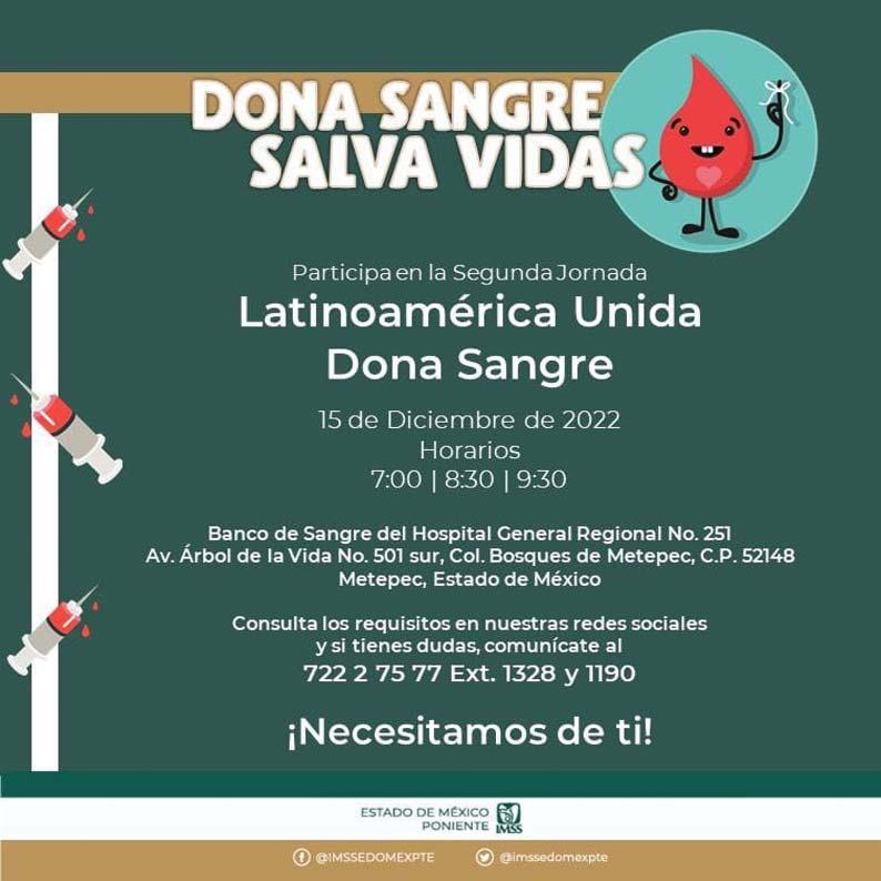El Instituto Mexicano del Seguro Social (IMSS) Estado de México Poniente exhorta a la población en general a sumarse a la "Segunda Jornada Latinoamérica Unida Dona Sangre", que se llevará a cabo el próximo 16 de diciembre.