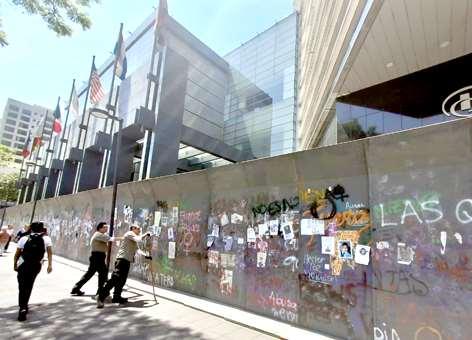 en un amplio recorrido por la ruta de la marcha de maestros se pudo observar a decenas de establecimientos que no abrieron sus puertas en tanto otros fueron protegidos por vallas metálicas de más de tres metros, con la finalidad de evitar actos vandálicos.