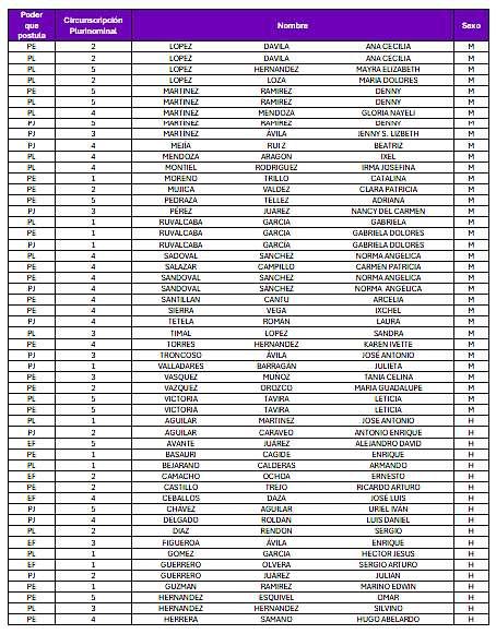De igual manera,el informe del INE destacó casos como el de Juan David Ramos Ruiz, quien pidió no participar,pero sigue en la lista.Además, María del Pilar López Rueda fue inscrita en un circuito diferente al ordenado por una sentencia del Tribunal Electoral.