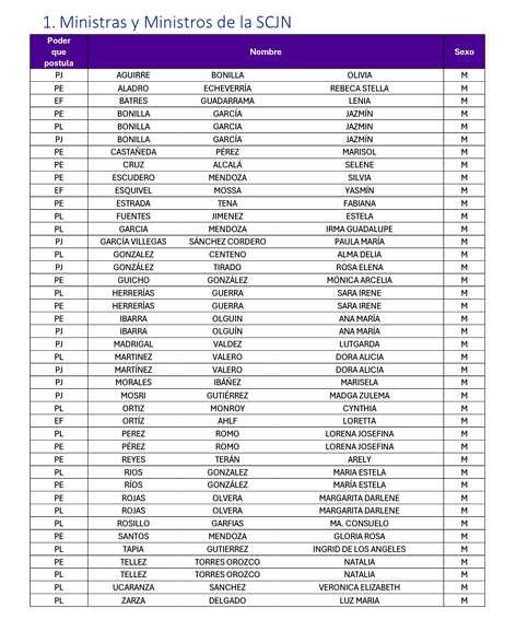 Otrosnombressonelde MariselaMoralesIbáñez, extitularde la desaparecida PGR; Paula María García Villegas Sánchez Cordero, hija de la ministra en retiro Olga Sánchez Cordero; así como Ana María Ibarra Olguín, Dora Alicia Martínez Valero, Jazmín Bonilla García, Lutgarda Madrigal Valdez, Magda Zulema Mosri Gutiérrez, Olivia Aguirre Bonilla y Rosa Elena González Tirado, quienes tendrán "pase directo" para competir por los cargos de ministras.
