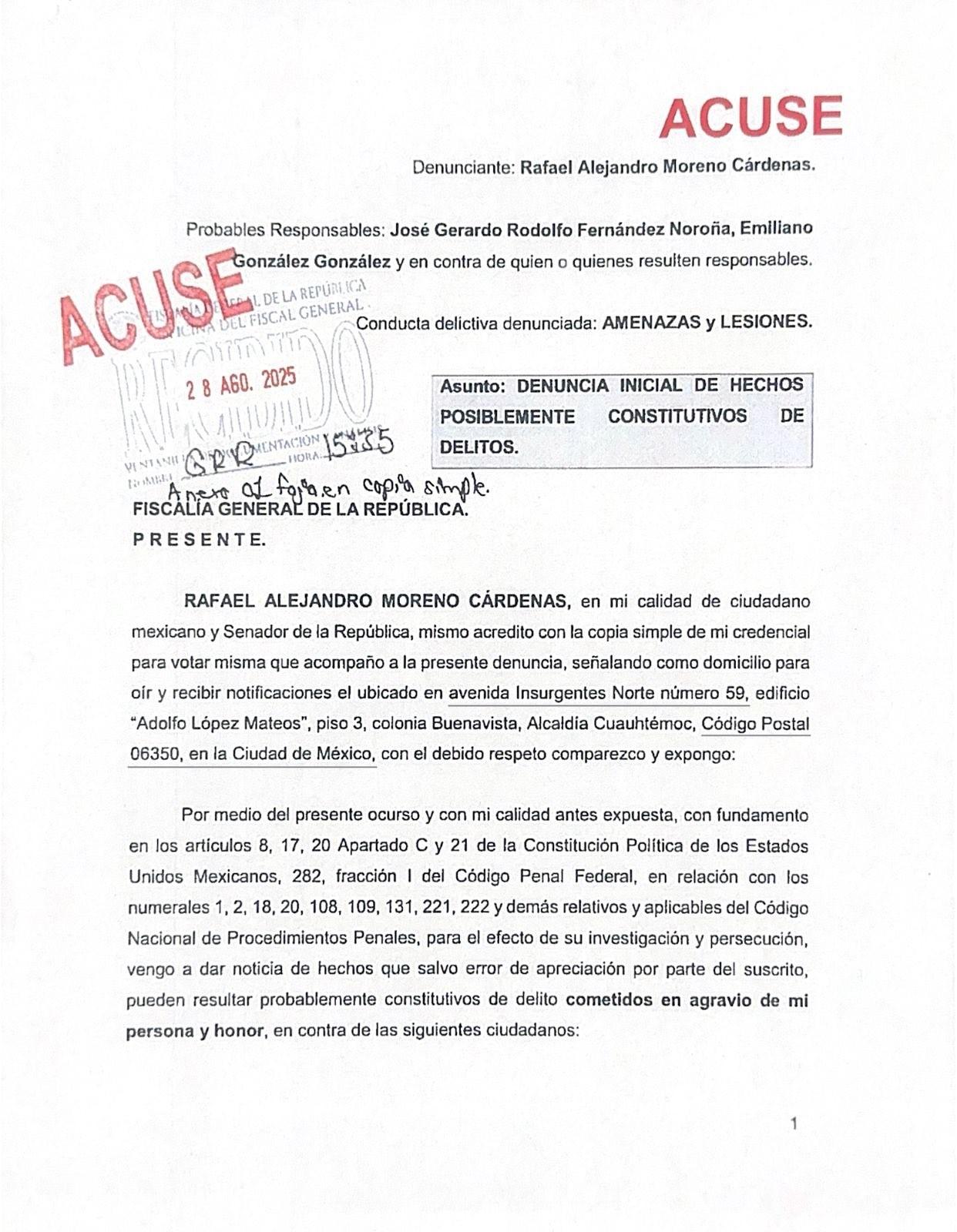 Alejandro Moreno Cárdenas,presenta una denuncia penal en contra del corrupto,cínico, cobarde y mentiroso presidente de la Mesa Directiva del Senado, Gerardo Fernández Noroña, y también contra EmilianoGonzálezGonzález,porlos delitosde amenazas y otros.