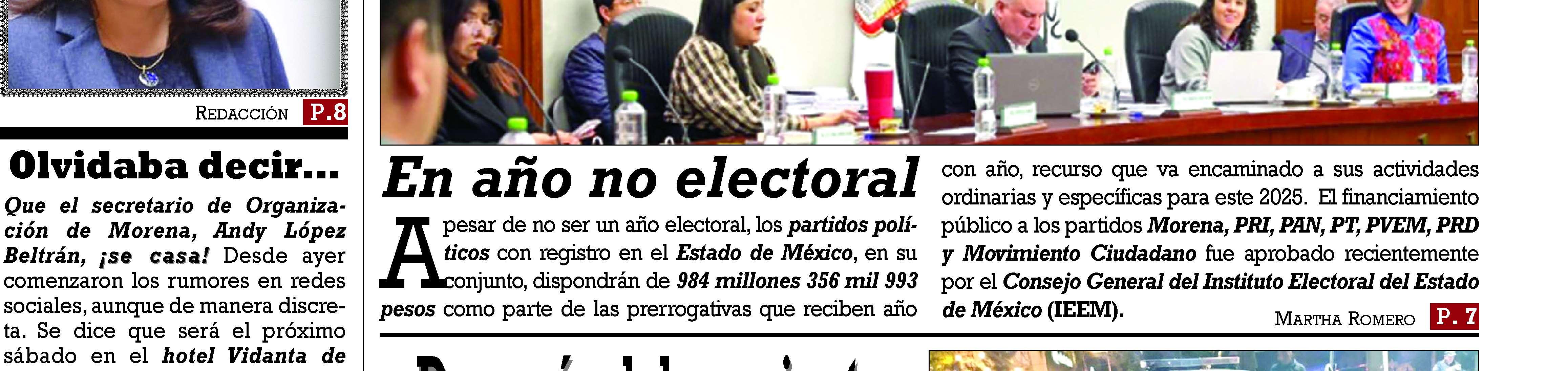 Apesar de no ser un año electoral, los partidos políticos con registro en el Estado de México,en su conjunto,dispondrán de 984 millones356mil 993 pesoscomo partedelasprerrogativas que reciben año con año, recurso que va encaminado a sus actividades ordinarias y específicas para este 2025.