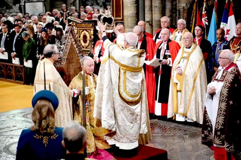 La reina Camila fue primero ungida con aceite en la cabeza por el arzobispo de Canterbury, primado de la Iglesia Anglicana, quien posteriormente impuso en su cabeza la corona de la María.