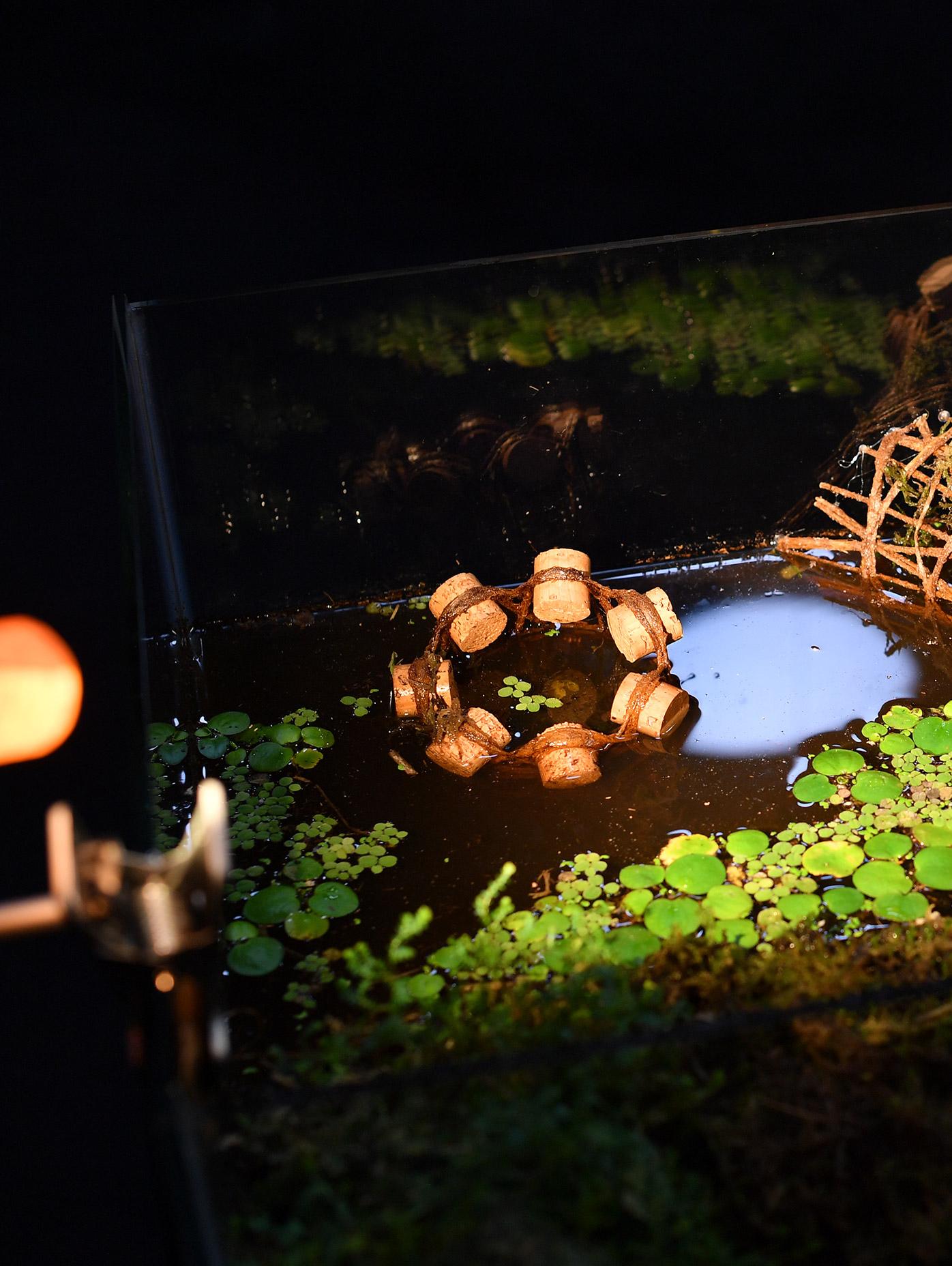 Un travail d’itération entre recherches algorithmiques et expérimentations avec la bre a pu aboutir à un algorithme paramétrique d’enroulement multi-axes pour générer le chemin de modules breux, tous uniques. Une fois assemblés, ils sont destinés à former des radeaux o ants, véritables suppo s de sphaignes réintroduites. Ces structures jouent un rôle d’amorce en stimulant l’apparition d’espèces pionnières. Leur caractère biodégradable et éphémère est étudié a n de limiter leur impact une fois la dynamique amorcée. Des expérimentations in situ de quelques modules ont déjà permis d’observer des résultats encourageants. À terme, il est espéré d’observer une régénération e ective de puits de carbone sur des zones plus larges.