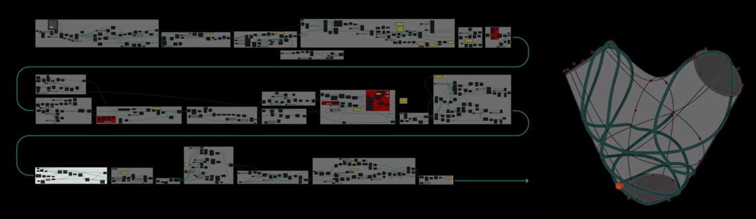 Le langage numérique guidant la génération des modules permet de se projeter vers une version du projet entièrement automatisable. À ce jour, la main de l’opérateur est guidée par une suite de points à suivre, préalablement calculés et positionnés progressivement dans un espace simulé. Avec ce procédé, le temps de production est en moyenne d’un module par heure avec un coût en matière première fo ement diminué par rappo aux suppo s en treillis plus classiques puisqu’ici, le volume tressé devient la structure elle-même.