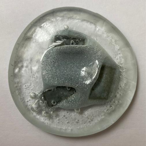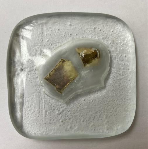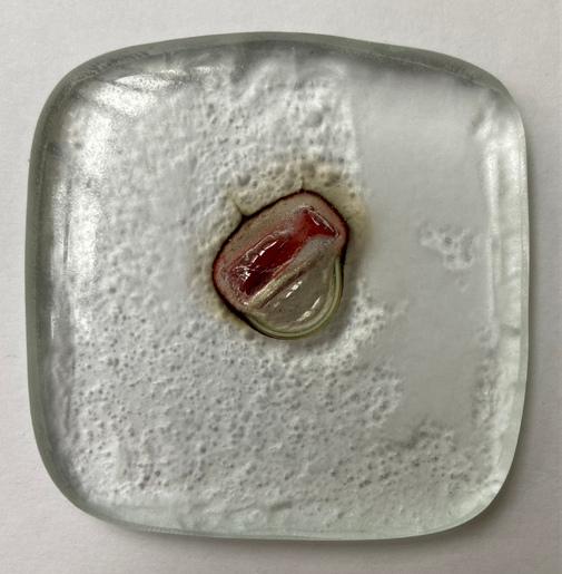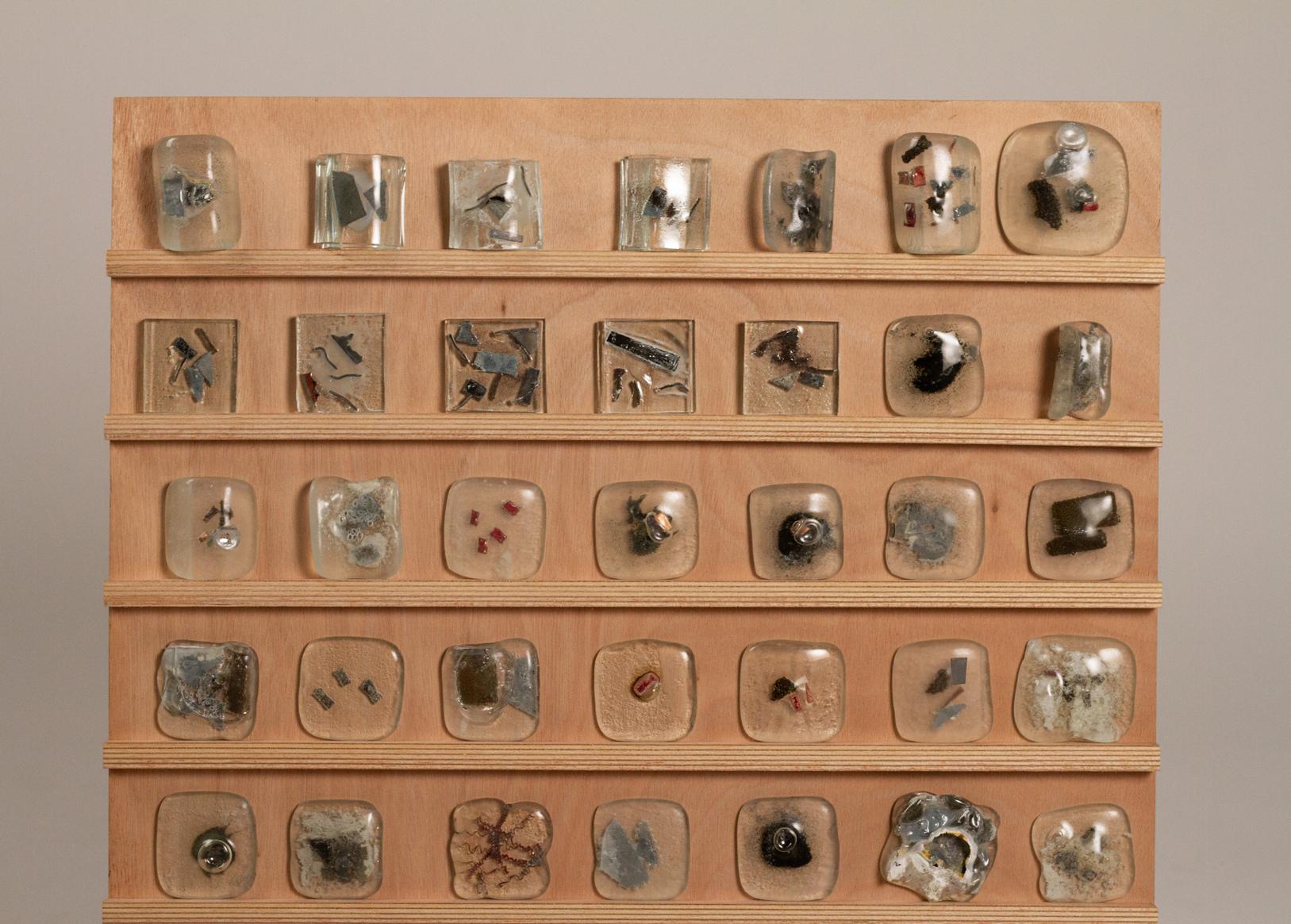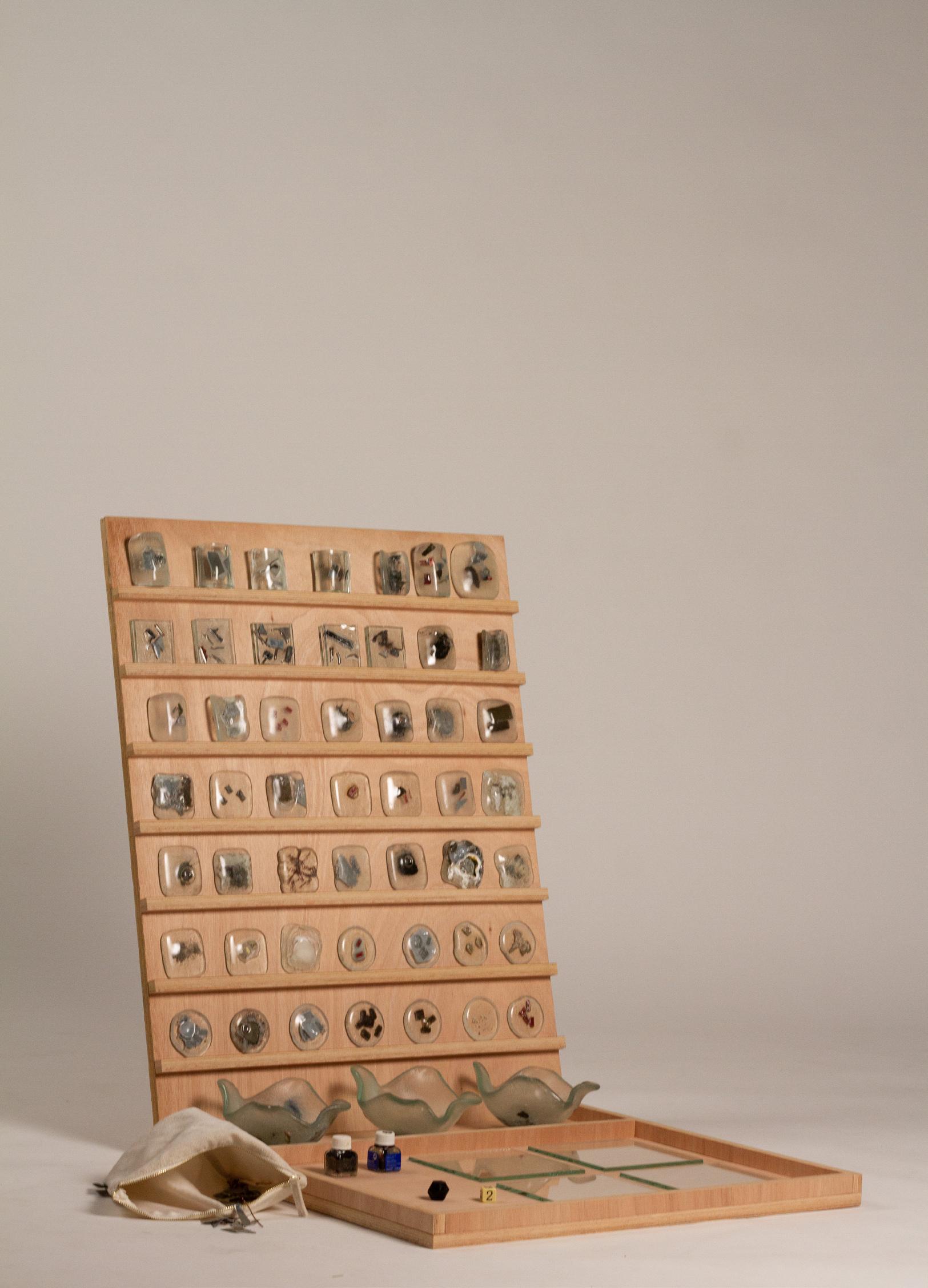 → Le présentoir est donné à l'école du verre Lucas de Nehou comme banque de donnée de référence sur les inclusions verre-méteaux et leurs effets plastiques. L'objet nous invite ici à explorer davantage.