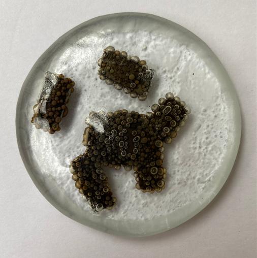 → Présentation des échantillons de toutes nos expérimentations. Le support horizontal, présente les 3 bols, comme des démonstrateurs. Le protocole de recherche est paratgé sous une forme plus ludique.