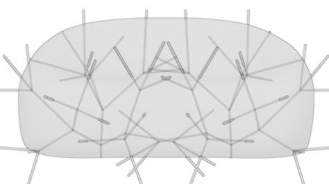 Mousse méso-structurée exible en polyuréthane thermoplastique par impression 3D. La répartition et la forme des cellules sont programmées dans la matière même de sorte à ce que la deformation du ballon audessus soit conditionnée speci quement une fois mis sous pression.