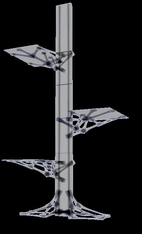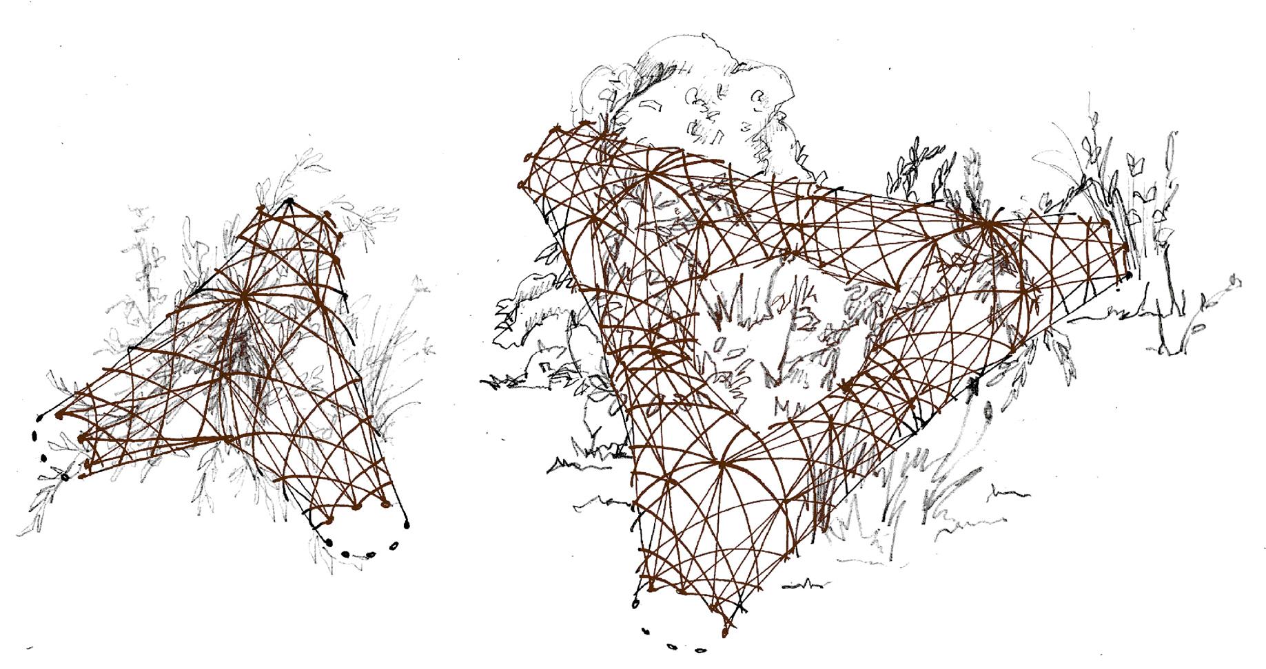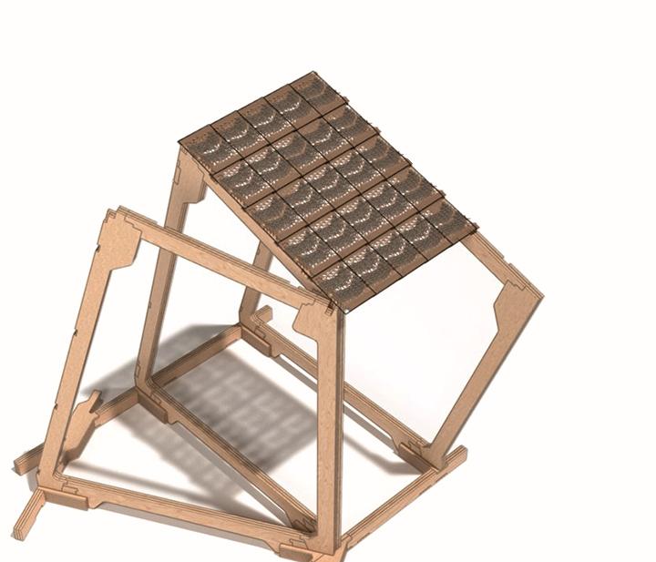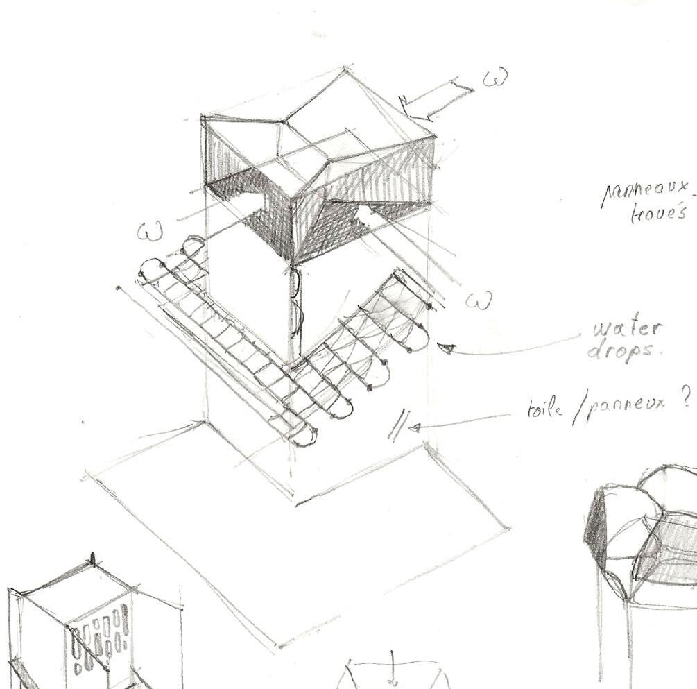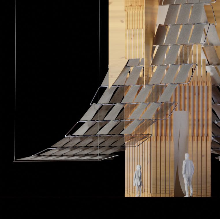 Ombrière Issue de réfléxions sur les comportements en essaims d’animeaux marins et de recherches sur des coques en bois thermo-formées translucides.