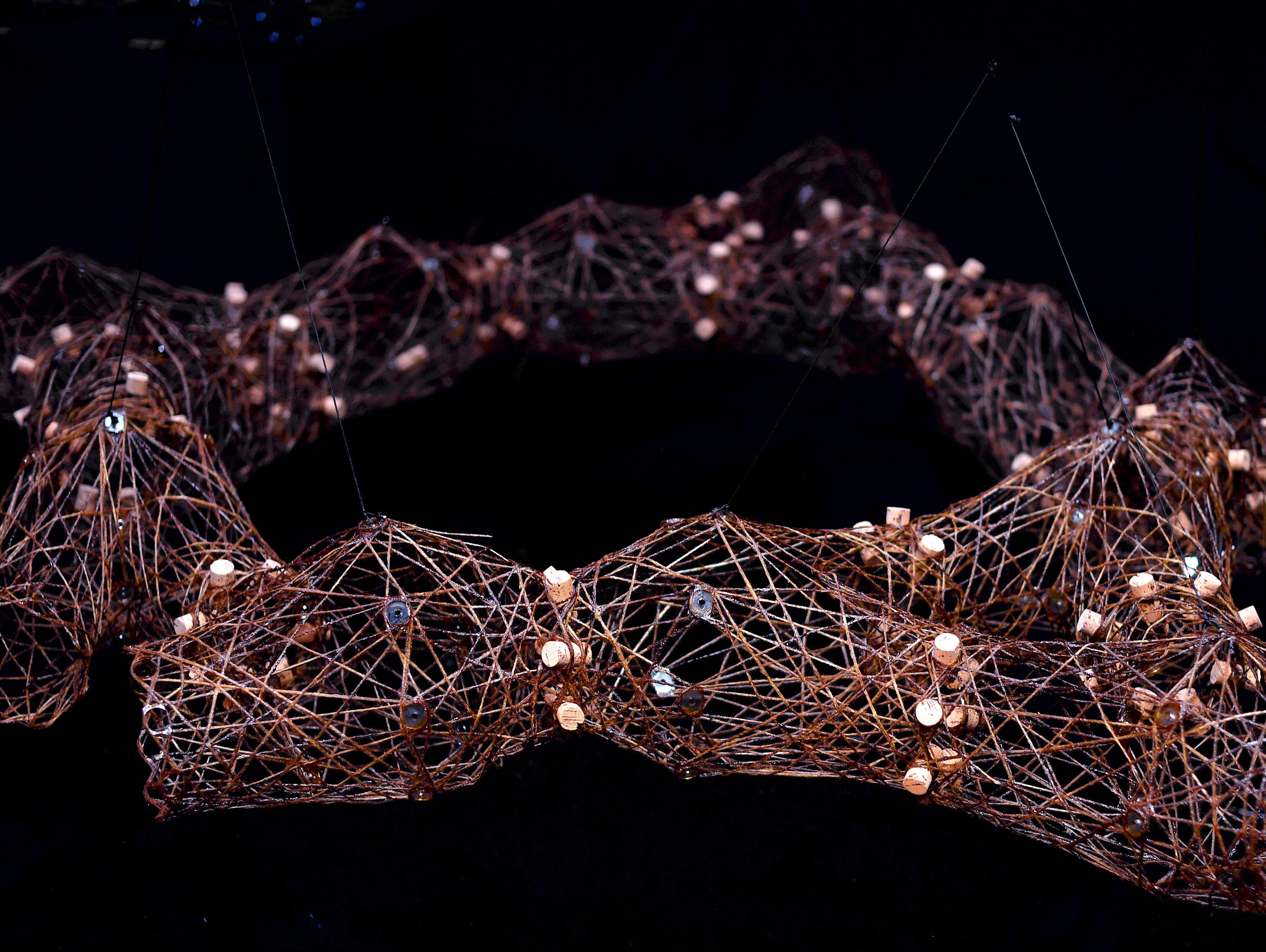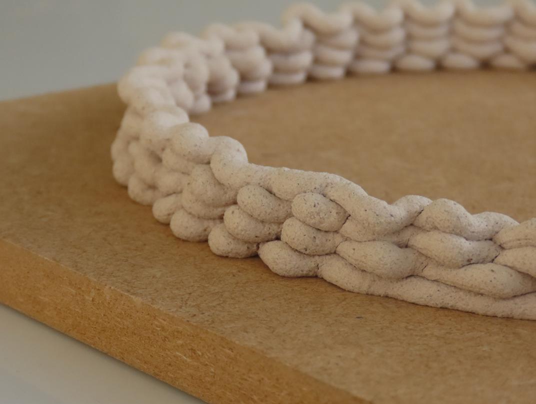 Une étagère composée de segments de fibres de lin enroulées.