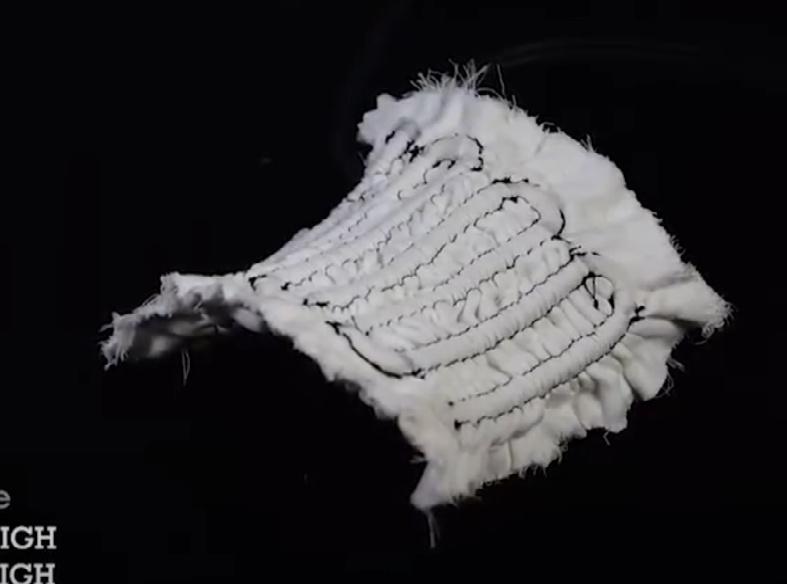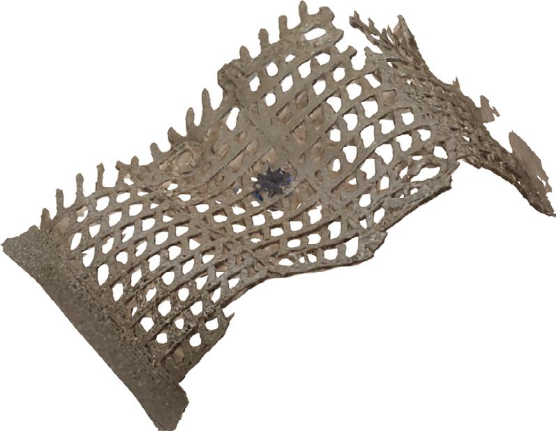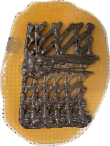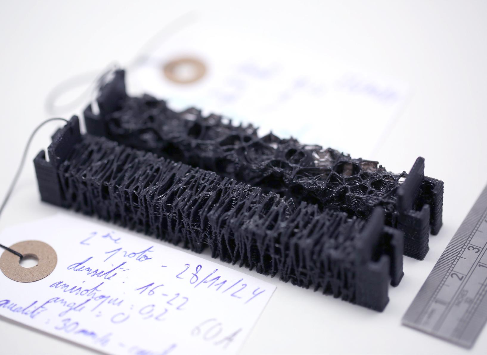 Mousse méso-structurée exible en polyuréthane thermoplastique par impression 3D. La répartition et la forme des cellules sont programmées dans la matière même de sorte à ce que la deformation du ballon audessus soit conditionnée speci quement une fois mis sous pression.